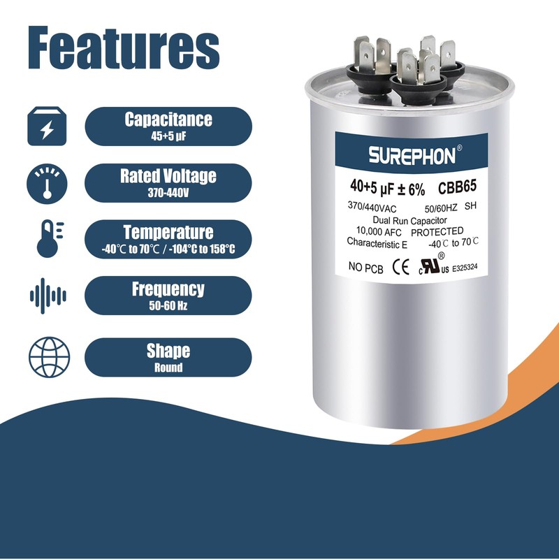 - High Performance Capacitor:SUREPHON 40+5 uF ±6% CBB65 oval AC capacitors are perfect replacements for 370V and 440V capacitors for a variety of air conditioning and HVAC applications