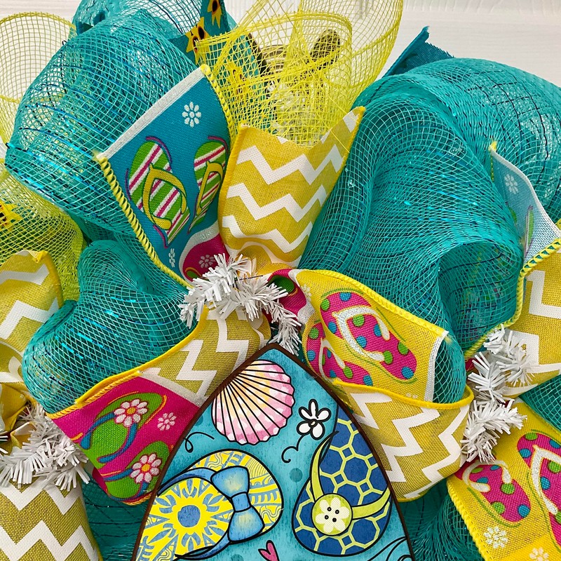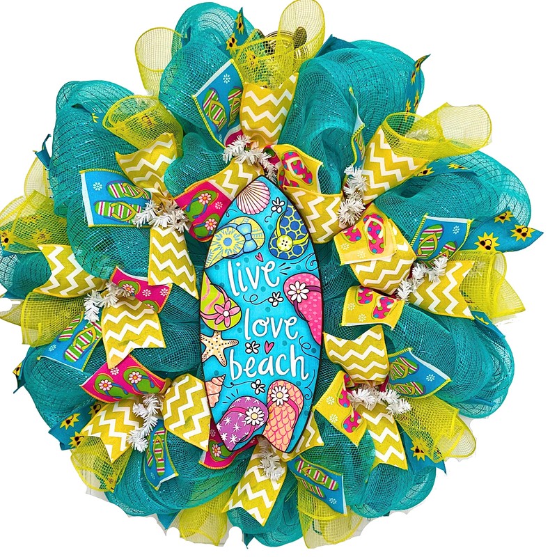 Surf Board Live Love Beach Handmade Deco Mesh Summer Wreath. Available in 24 inch and 28 inch diameters. High Quality.
