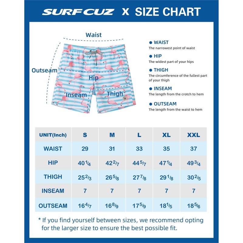 - 7 INCH MENS BATHING SUITS: These swim trunks are cut above the knee to showcase your style.Available in sizes XS/S/M/L/XL/XXL, these trunks accommodate a wide array of body types. If you are considering between the two sizes, we suggest you choose the larger one
