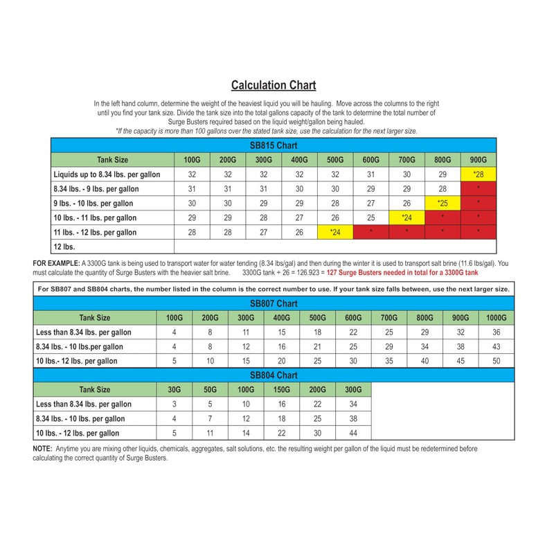 • 1 Surge Buster is good for every 32 gallons (takes up 0.8% of tank volume / 8 gallons per 1000 gallons)