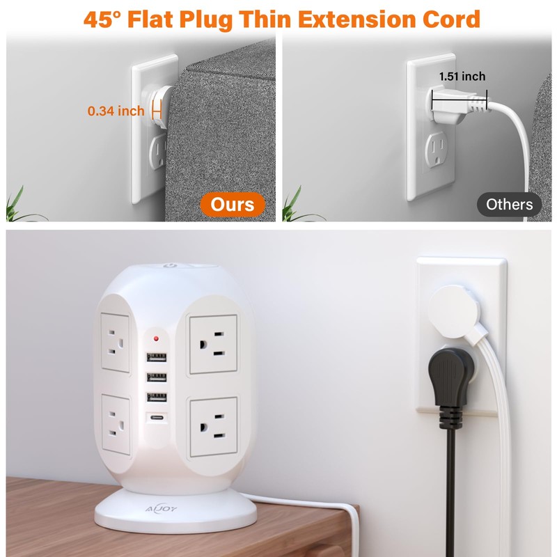 - 12-in-1 Power Strip Tower: This flat plug power strip with usb ports with 8 wide-spaced AC outlets and 4 USB ports, allowing up to 12 devices to connect simultaneously. The 2.2-inch spacing accommodates large plugs without blocking each other