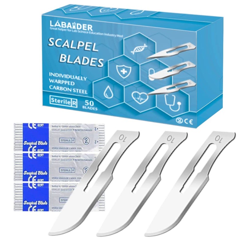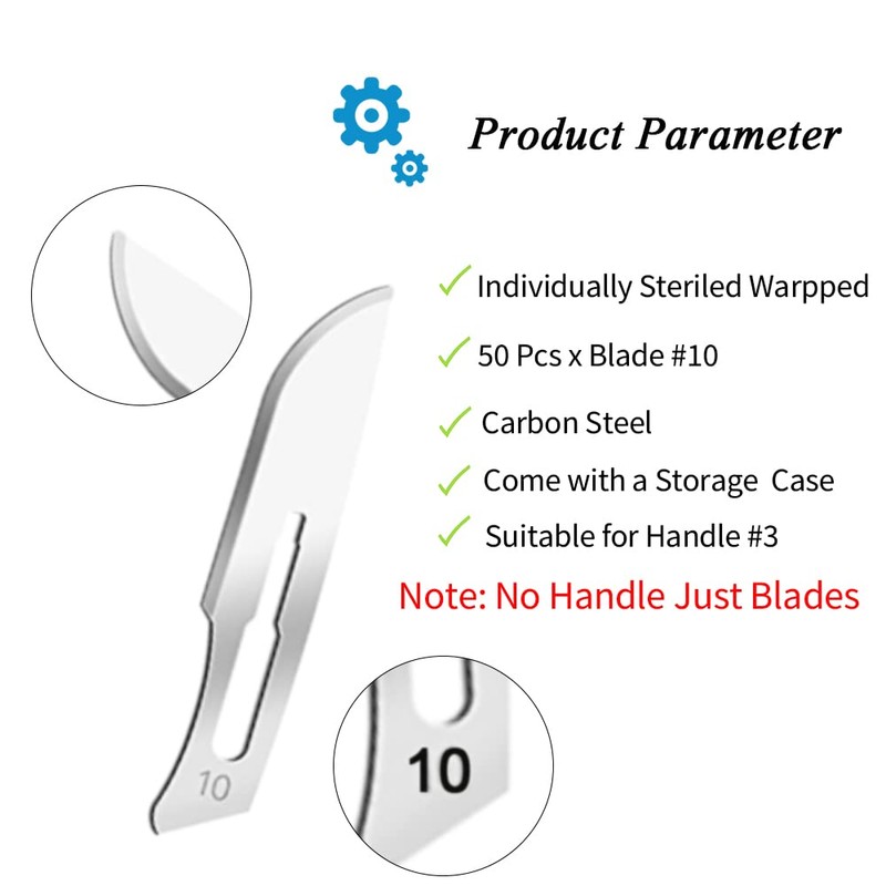 - 50 Pcs 10# Superior carbon steel blades with individual foil wrapped ensures precision cut. Sterilized by gamma radiation.