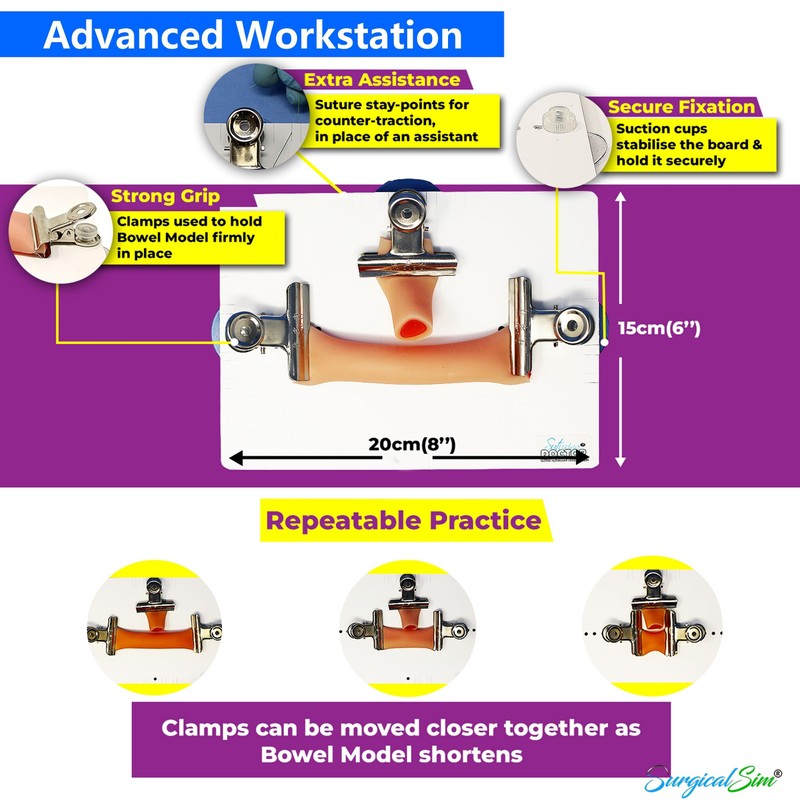 - MULTIPLE PRACTICE OPPORTUNITIES: the durable, reusable Silicone Bowel Models are designed to be used countless times. Simply use the thread materials provided, then once finished, remove the threads from the Silicone Bowel Models and practice anew. Sometimes users may choose to cut the ends of the Bowel Models to practice on new working ends, thus making the Bowel Model shorter in length. In this case the workstation has been designed with extra guide holes so that the clamps and suction cups can be moved closer together, if the bowel model is cut shorter, saving you from having to buy more materials