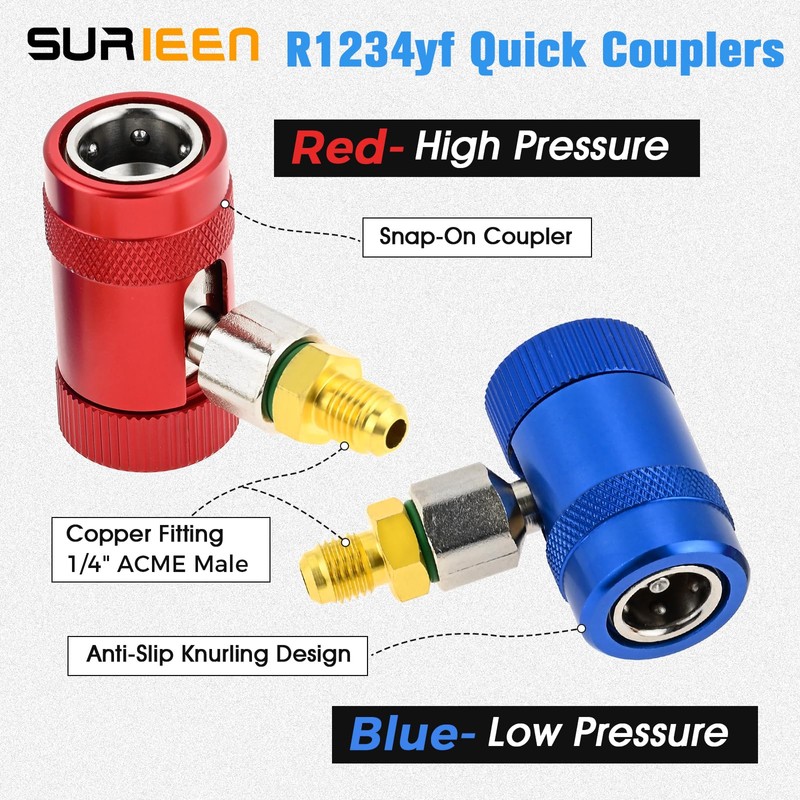 - 【R1234yf Couplers】The high and low pressure side Adjustable r1234yf couplers are greatly used for newer foreign and domestic cars, trucks, SUVs, and other vehicles with r1234yf AC systems. The couplers nuts are deeply knurled for quick finger-tightening, opening adapter using their top control knobs, it's very simple to closure and disconnection.