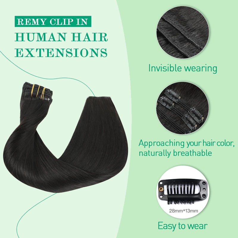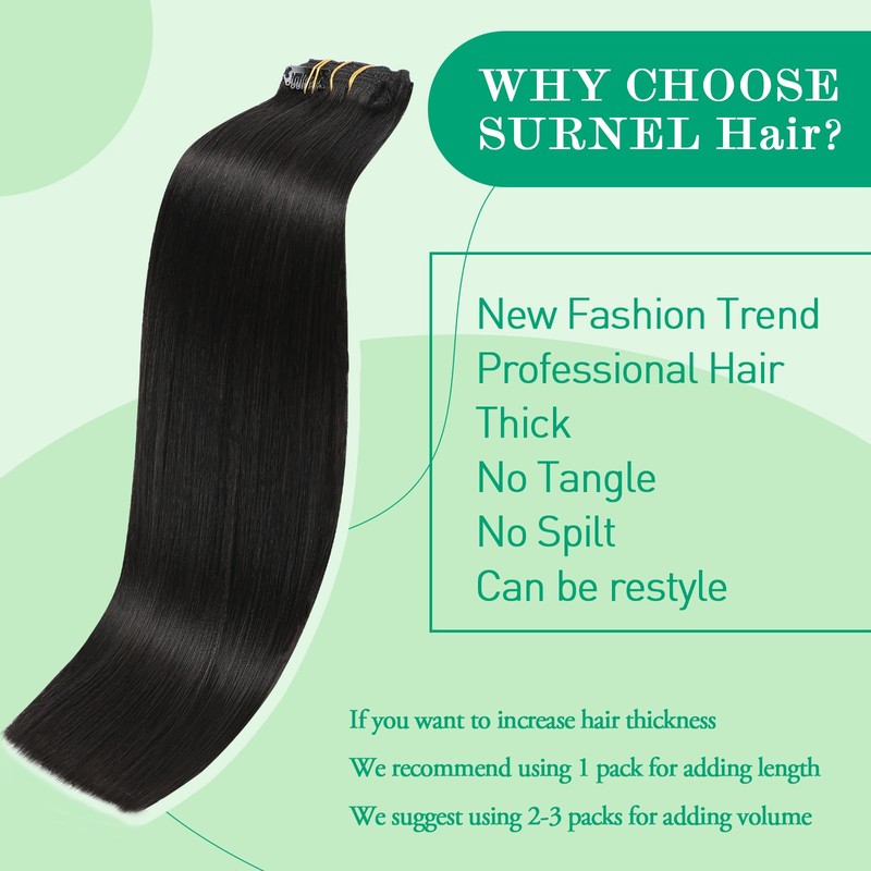 SURNEL Clip-In Extensions, Natural Black, Remy Real Hair Clip-In Extensions, Real Hair, 20 Inches / 50 cm, 7 Pieces, 160 g, Double Wefts, Clip-In Remy Brazilian Hair, Straight (7C#1B-20 Inches)