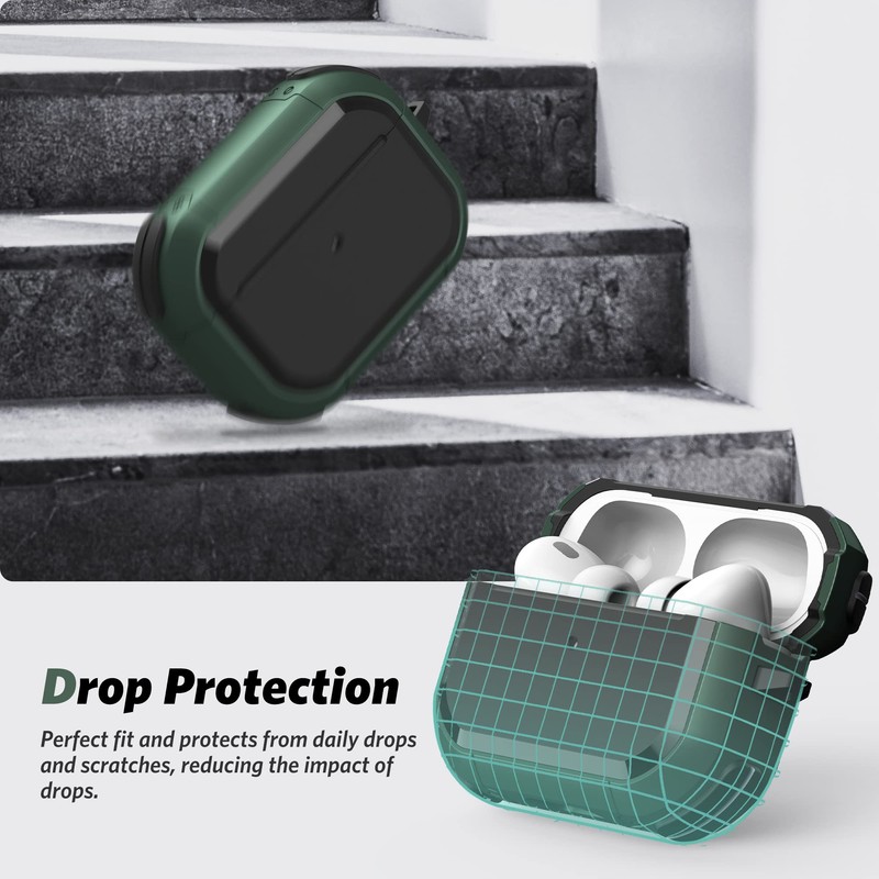 - đ§ăTough Armor ProtectionăThe combination of rugged PC and flexible TPU with anti-slip stripe design, protect your AirPods Pro 2 from drops, scratches and bumps. Four thicken corners absorb shock from drop and fall.
