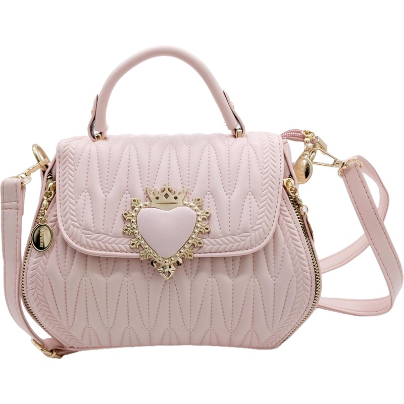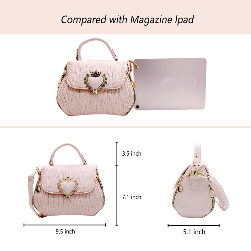 SURPRISE PIE Women Leather Quilted Handbag Top Handle Satchel Bag with Heart Crown Decoration, Pink, Small