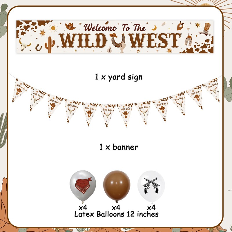 12 x 12'' latex balloons (8 white, 4 brown) 1 x welcome to the wild west yard banner 1 x wild west banner 2 x white ribbons