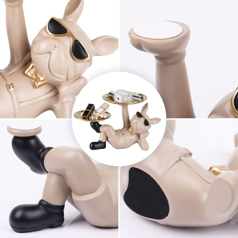 - 【Material and Function】The French Bulldog statue is made of high quality resin material, which is environmentally friendly and safe. Bulldog storage tray statue provides two metal trays that can be used as an exclusive space for personal storage, the trays are not easy to rust, not easy to break, can hold keys, watches, jewelry, cosmetics, candy and other small objects, can make the original cluttered desktop become more neat and tidy.
