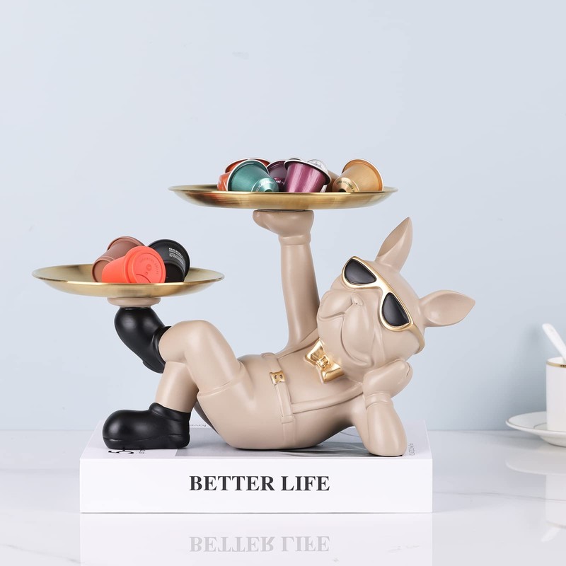 - 【Material and Function】The French Bulldog statue is made of high quality resin material, which is environmentally friendly and safe. Bulldog storage tray statue provides two metal trays that can be used as an exclusive space for personal storage, the trays are not easy to rust, not easy to break, can hold keys, watches, jewelry, cosmetics, candy and other small objects, can make the original cluttered desktop become more neat and tidy.