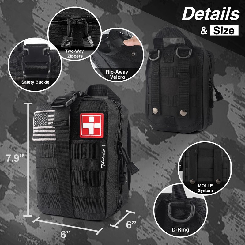 - Compact, Well-Organized, Lightweight ▶ Neatly packed with 60 pcs tactical survival tools and high quality wound care first-aid supplies, weighs 1.9 lbs only, measures 7.9" x 6" x 6", molle-compatible. Perfect for outdoor wilderness adventures such as camping, boy scouts, hiking, hunting and mountain biking, etc.