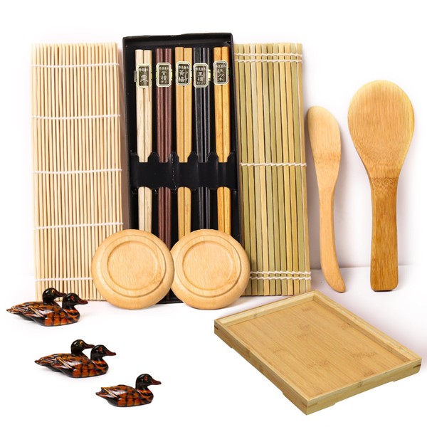 - COMPLETE SUSHI PREPARATION TOOL Our sushi kit contains all the tools you need to make delicious sushi with ease. The set includes a rice spoon, a high-quality bamboo knife, two sushi mats, two beautiful wooden plates, five pairs of chopsticks and five Yuanyang chopsticks and last but not least, a practical sushi tray. This set helps you create an outstanding sushi experience and enjoy the sushi set to make yourself!