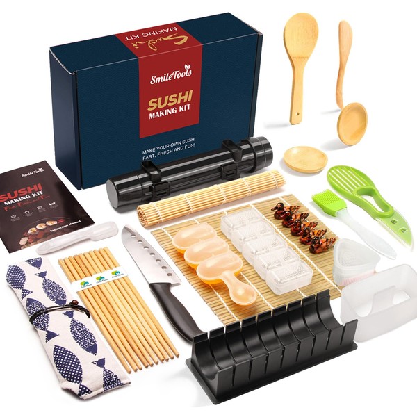 SmileTools Sushi Making Kit, 28 in 1 [Parent-Child] Sushi Roller Kit with Bamboo Mats, Sushi Bazooka, Nigiri Gunkan Sushi Mold, Musubi Maker, Rice Ball Mold & More