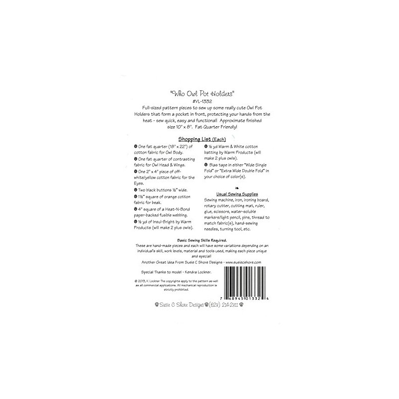Full sized pattern pieces to sew up some really cute Owl Pot Holders that form a pocket in front- protecting your hands from the heat- sew quick, easy and functional! Approximate finished size 10" X 8" Fat quarter friendly.