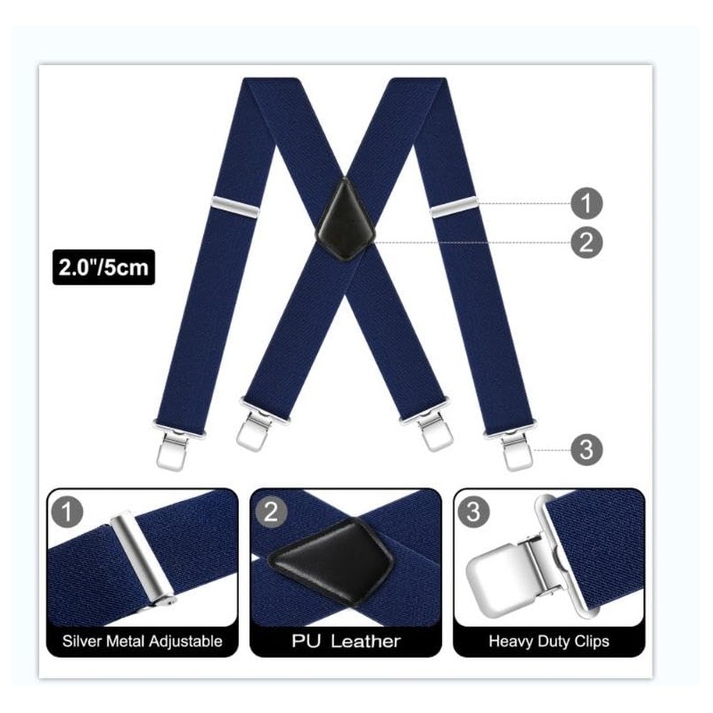 - 【Excellent Material】75% polyester & 25% elastic fabric + wear-resisting synthetic leather + 2pcs heavy duty metal adjuster + 4pcs heavy duty metal suspender clips. Specifically designed for big and tall men, navy suspenders come equipped with heavy-duty clips that provide a secure fit.