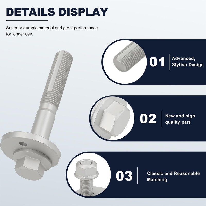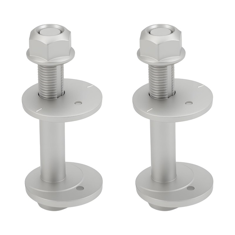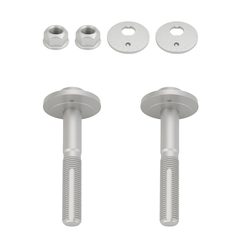 - Package Included:2 camber adjusting eccentric bolts, 2 lower control arm adjust cams, and 2 suspension trailing arm nuts