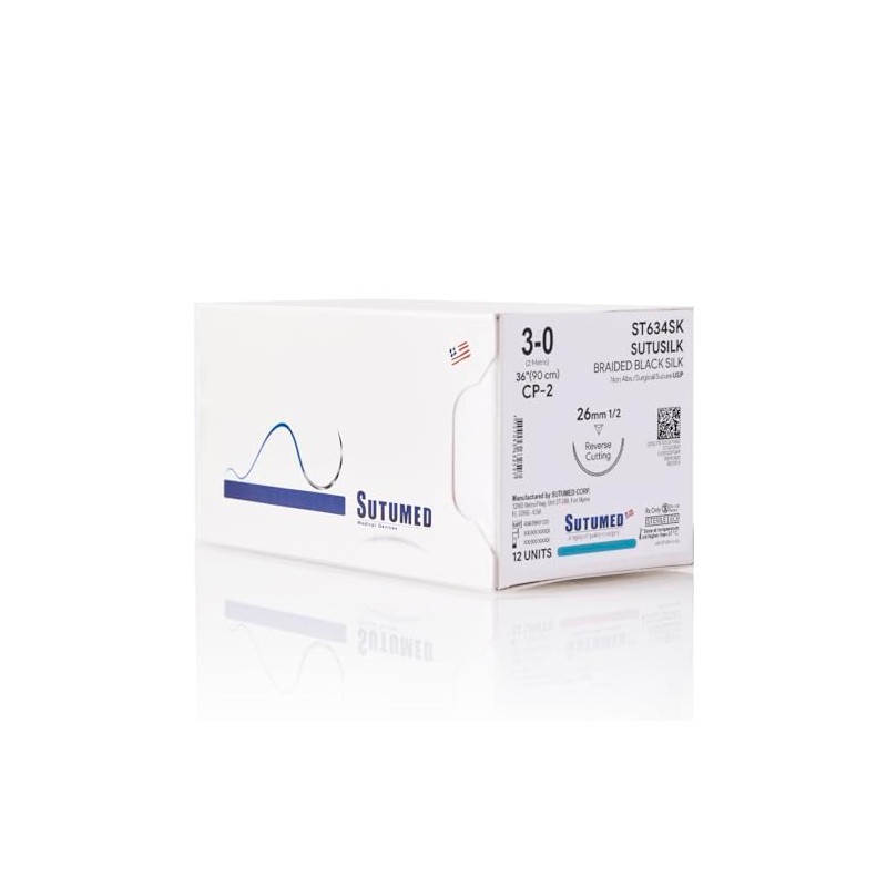 Sutumed SUTUSILK Non-Absorbable Silk Surgical Suture USP Size 3-0, 1/2 26mm Reverse Cutting Needle, 30 Inches (76 cm), 12 Count