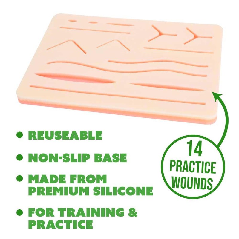 - DURABLE SUTURE PAD: This suture pad is made of premium silicone and can be reused multiple times with a non-slippery base for added strength & durability. This Suture Practice Kit includes all the needed tools to help you start right away. Our suture pads come with multiple pre-wounds replicating wide range of common wounds that you will encounter in training.