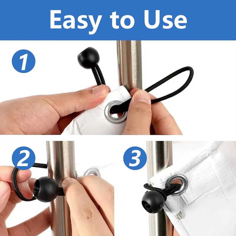 • Easy to use: this ball tarpaulin tensioner is easy to use, the rubber cords are easy to remove and connect. Simply pass the elastic band through the eyelet, attach it to the bar and then pull the looped end over the ball. Ball awning tensioner can be quickly removed and reused elsewhere