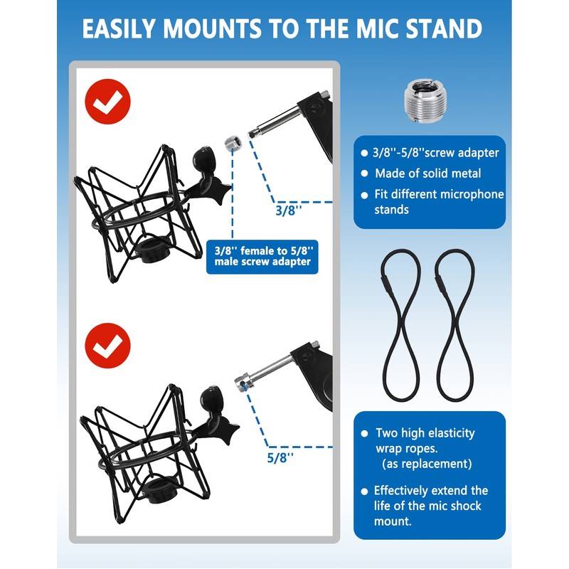 Package List:1 x Microphone Shock Mount; 1 x 3/8’’Screw Adapter; 2 x rubber rope; 4pcs different size bottom screws