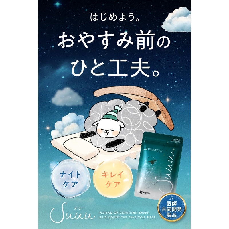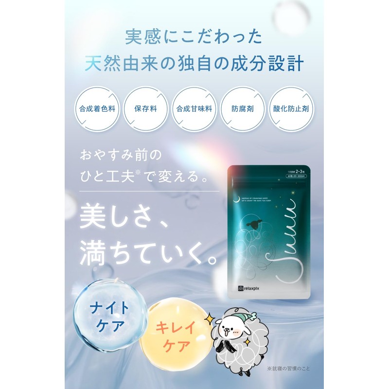 - 🐏【上質な休息と美容のための独自処方】Suuuはナイトケアの新提案としてサポート成分となるGABA、テアニン、カモミールエキス、ラベンダー粉末、美容サポート成分としてヒアルロン酸、CICAエキス、セラミド、グルタチオン(トルラ酵母)、NMNの他にリポソーム型を始めとする5種のビタミンCを独自に配合したナイトケアサプリメントです。おやすみ前のひと工夫で変える新習慣をサポートします。