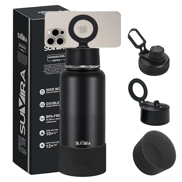 Suvira Stainless Steel Insulated Water Bottle & Magnetic Lid-Compatible with MagSafe,Tripod Phone Mount,&Phone Holder Travel Thermos, Sport,Yoga, Gym Keeps Hot for12 H,Cold 24H (Black, 32 Ounces)
