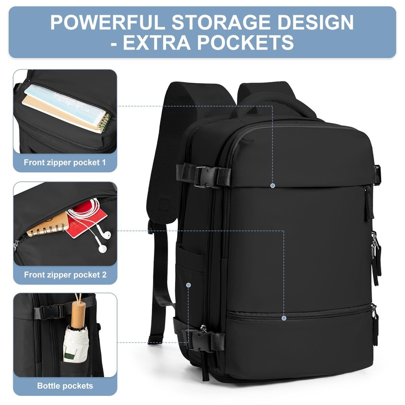 Travel Backpack Simple Durable Carry On Backpack with Shoe Compartment, Personal Item Travel Bag Flight Approved, Water Resistant Laptop Backpack for Women Men Weekender Business, Black