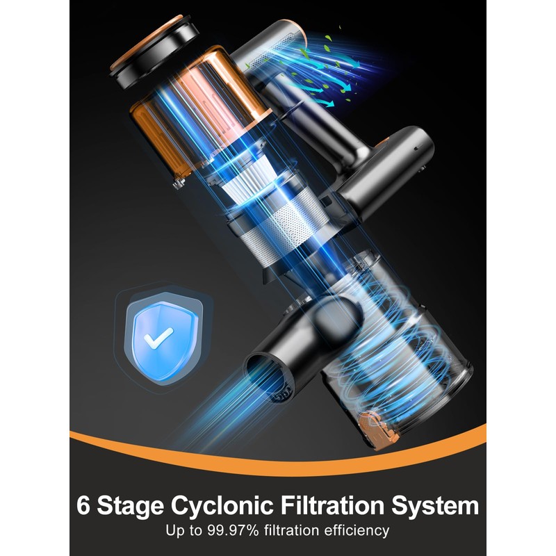 - Multiple High-Efficiency Filtration:Vacuun cleaner benefit from the 6-layer filtration system featuring new cyclone technology and a high-density mesh design. This system removes up to 99.99% of tiny dust particles as small as 0.1 microns, protecting the engine and keeping indoor air clean, Let your family feel like they are always breathing forest air.