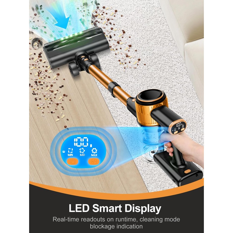 - Smart LED Display:Stick vacuum stay informed with the real-time LED display that shows remaining power, suction mode, and blockage reminders. User-friendly physical button switches and suction adjustments prevent accidental touches, making your cleaning tasks simpler and more convenient.