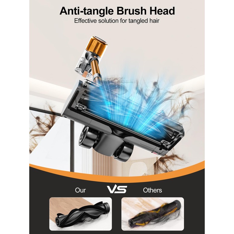 - Upgraded Green Light & Anti-Winding Floor Brush:The cordless vacuum with a V-shaped anti-tangle floor brush lifts embedded dirt and pet hair from carpets and hard floors, reducing hair tangles and cleaning time. The brush head supports 270° rotation and green LED light can detect dirt more accurately than the traditional white LED light, thus performing a thorough cleaning.