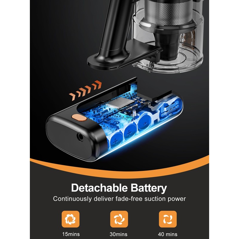 - Detachable Battery & Long-Lasting Runtime:Powered by a 6*2200mAh high-capacity, rechargeable battery, enjoy up to 40 minutes of runtime in standard mode. The removable battery can be charged separately, you can confidently complete your cleaning tasks without interruption. Say goodbye to the hassle of constantly charging your home vacuum mid-clean!