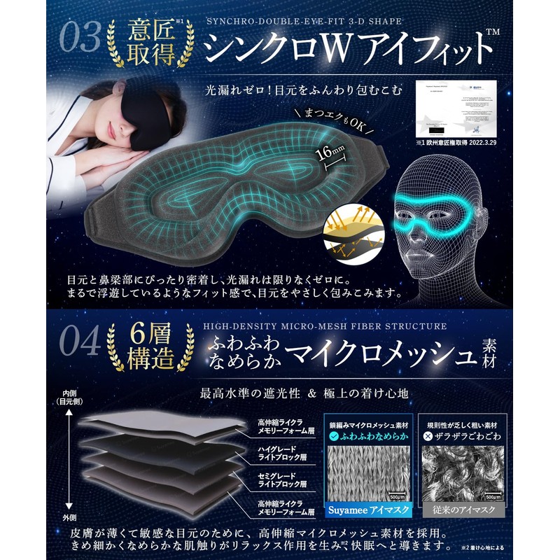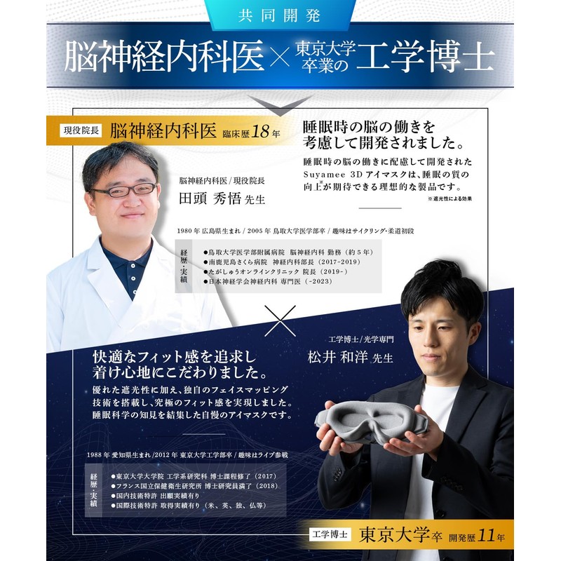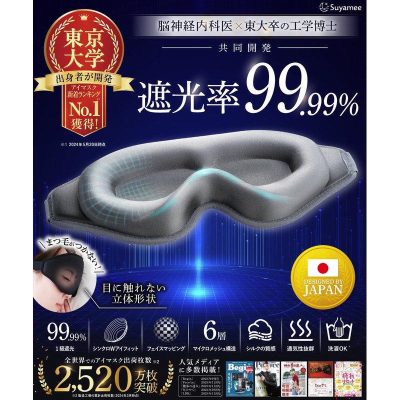 - Developed by Tokyo University of Engineering and Doctor: Kazuhiro Matsui (11 years of development) and the active chief Hidego Tagami (18 years of clinical history) collaborated with the active chief Shugoo Tagami (18 years of clinical history) to develop an ideal sleep mask. 99.99% light blocking rate certified by a Japanese Quality Assessment Center to block out almost all outside light. In addition, the Asian-specific skeletal structure is reconfigured with CG and the three-dimensional shape derived from hundreds of prototypes to create the ideal fit