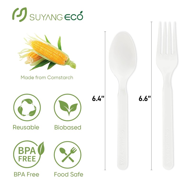 Our compostable spoons and forks bulk are made of natural corn starch PLA, 100% plastic free, no toxic fumes or harmful chemicals, safe to use and avoid environmental pollution, best alternative to plastic spoons and forks.  Compostable spoons bulk is made of high quality material, strong and durable, not easy to break when using, you can use disposable spoons and forks to eat anything.  Compostable utensils bulk has good heat and cold resistance, making it ideal for eating hot and cold foods, and won't soften or bend when it comes to hot foods like other biodegradable cutlery.  Heavy duty compostable forks and spoons has a polished surface design with rounded, non-slip edges for a comfortable grip and ergonomic design for effortless, safer and more convenient use.  Disposable biodegradable white forks and spoons easily coordinate with the surrounding decor, perfect for camping, picnics, lunches, catering, barbecues, parties, weddings, restaurants and more. After the party, you no longer need to worry about freeing up your hands to do the dishes. Make it easy for you to enjoy your entertaining time.  Using eco-friendly compostable spoons and forks reduces your carbon footprint, reduces disposable plastic silverware, reduces landfill waste, and reduces harmful residue in the environment.