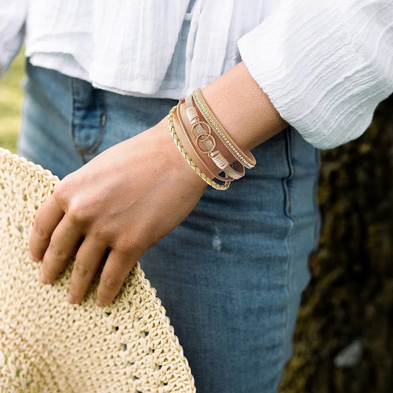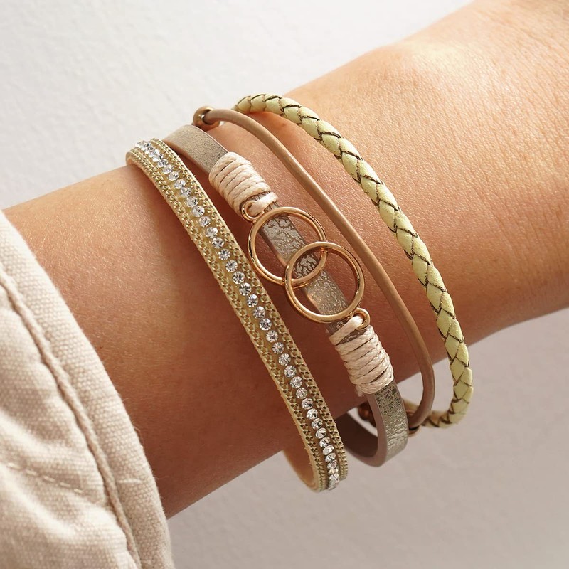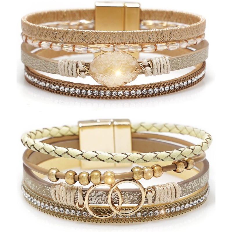Suyi Multilayer Leather Bracelet Set 2 Pieces Beads Wrap Bracelet Wrist Cuff Bangles with Magnetic Buckle for Women Circle Gold Set 8