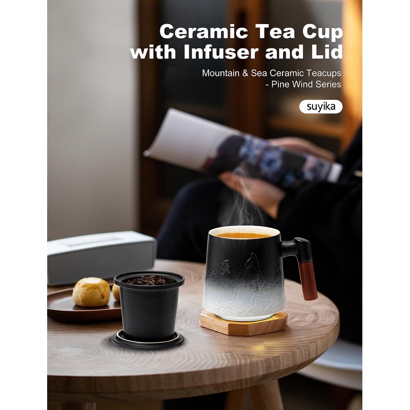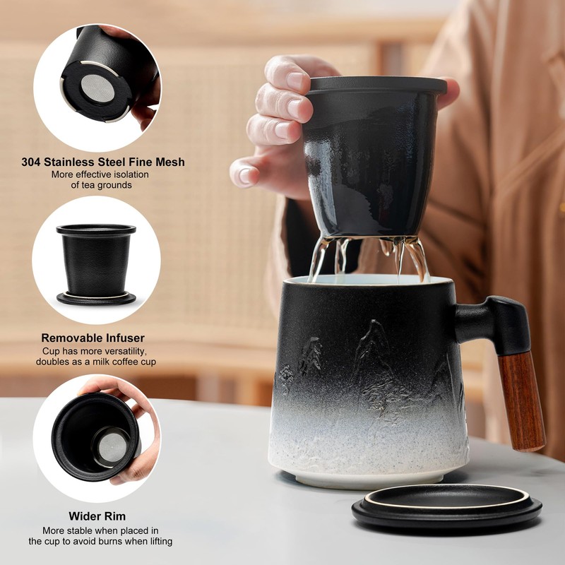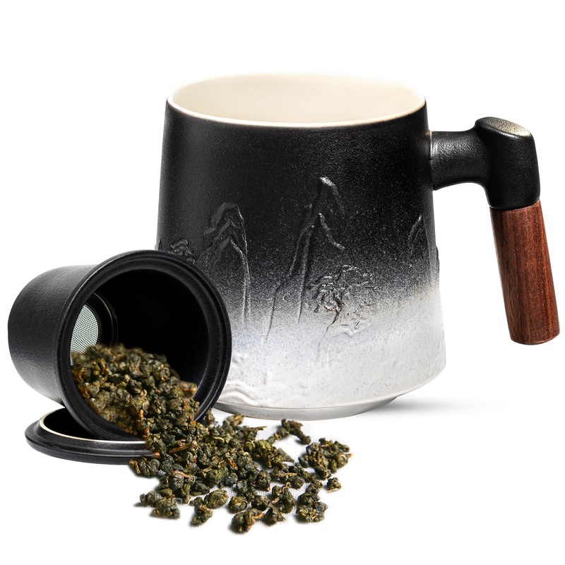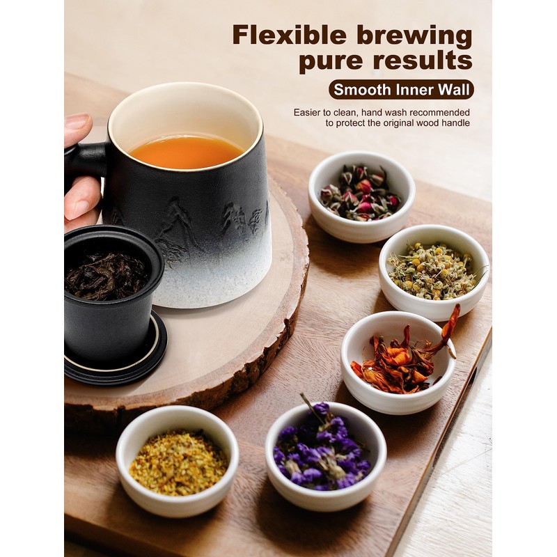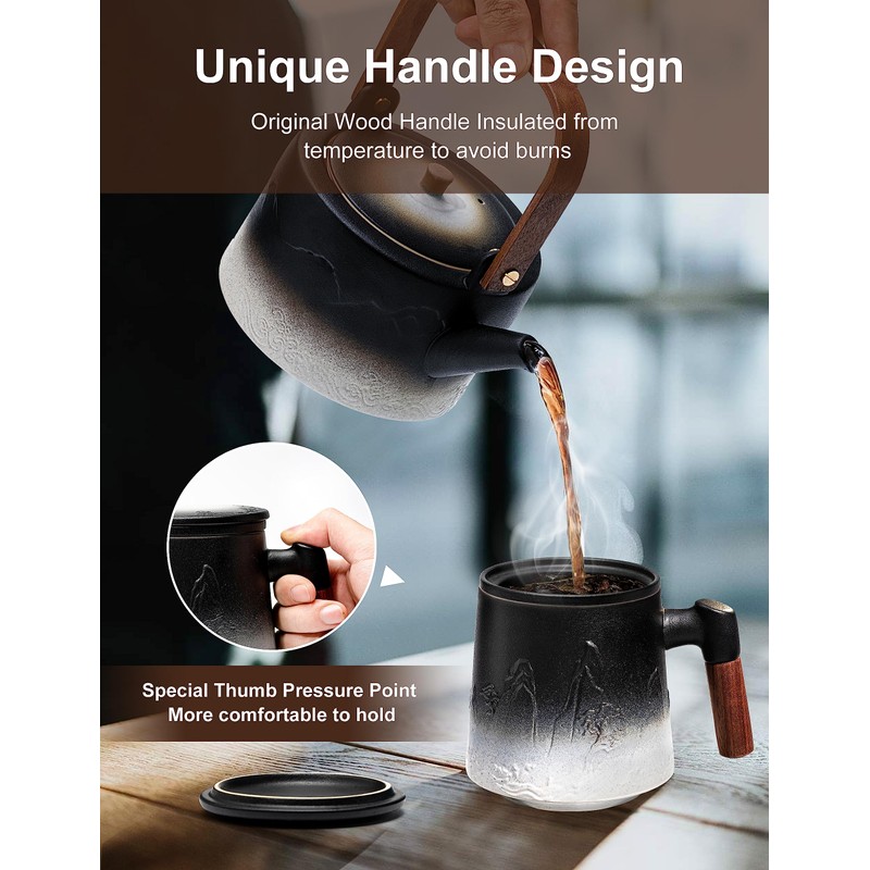 - Design Concept - Mountain & Sea:Appearance combining with the gradient embossed of mountain and sea, the wooden handle has anti-scald and heat-insulating, Ceramic infuser make tea residue can be filtered more efficiently.