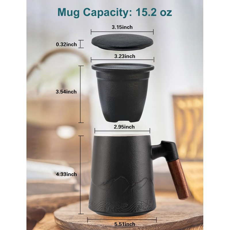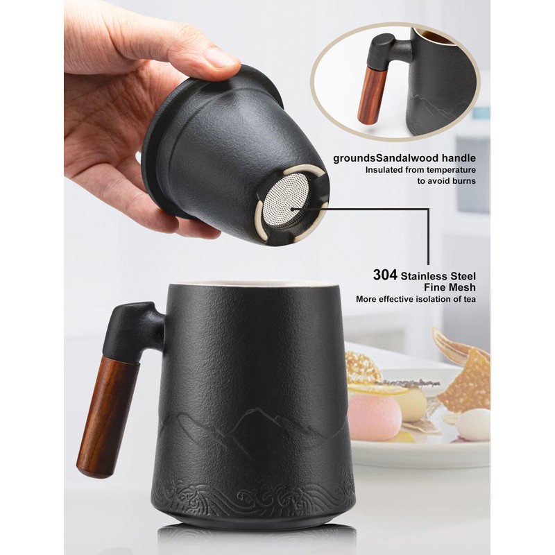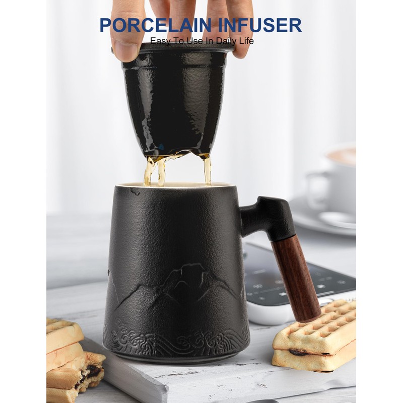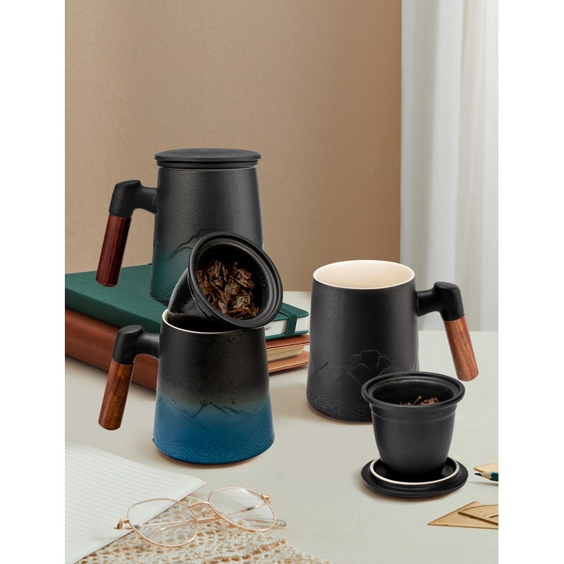 - Design Concept - Mountain & Sea:Appearance combining with the gradient embossed of mountain and sea, the wooden handle has anti-scald and heat-insulating, ceramic infuser make tea residue can be filtered more efficiently.