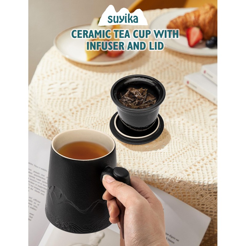 suyika Tea Cup with Infuser and Lid, 15.2 Ounce Wood Handle Ceramic Loose Leaf Tea Mug,Embossed Tea Steeping Mug for Gifts, Gradient Black 450ml