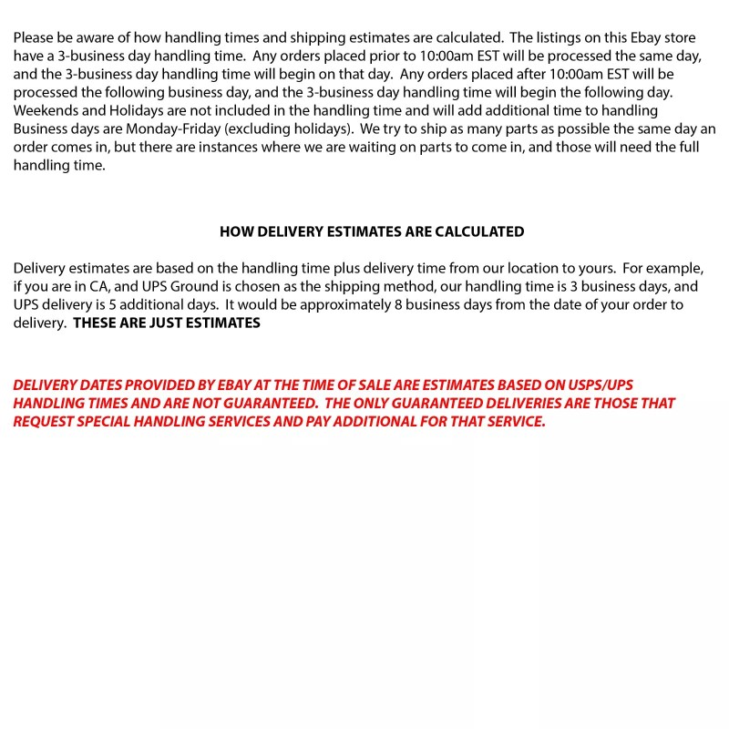 Order Processing & Handling: All orders begin processing either same or next business day. Any orders placed after 5pm ET will be processed on the next business day. We are closed every Saturday, Sunday, and for all US holidays. Orders that can be fulfilled immediately from our warehouse will normally ship out within 1-2 business days. We try our best to keep our inventory as stocked as possible, however not all items are in always stock and may need to be ordered from the manufacturer/distributor prior to shipping and may require an additional 3-5 business days for processing. If we estimate your order will take 5+ business days before shipping we will do our best to notify you ahead of time. Shipping and Handling Charges: Shipping prices are flat rate. Hawaii, Alaska, and international orders may have an increase in shipping costs. We will notify you directly if there is an increase in the shipping charge for your order prior to billing and shipping. Domestic Shipments: Packages are shipped via USPS or UPS to the lower 48 states. APO/FPO, P.O. Boxes and shipments to Alaska and Hawaii will be shipped strictly via USPS. Tracking information will be provided to you as soon as the item leaves our warehouse. International Shipments: All international orders are shipped via USPS. All International orders are subject to inspection and clearance through customs. We are not responsible for any taxes, duties or fees incurred. Buyer is responsible for knowing their countries specific policies/procedures. If a special shipping method is required please call us and let us let us know as soon as possible and we will be happy to assist you. **We reserve the right change the carrier under certain circumstances**
