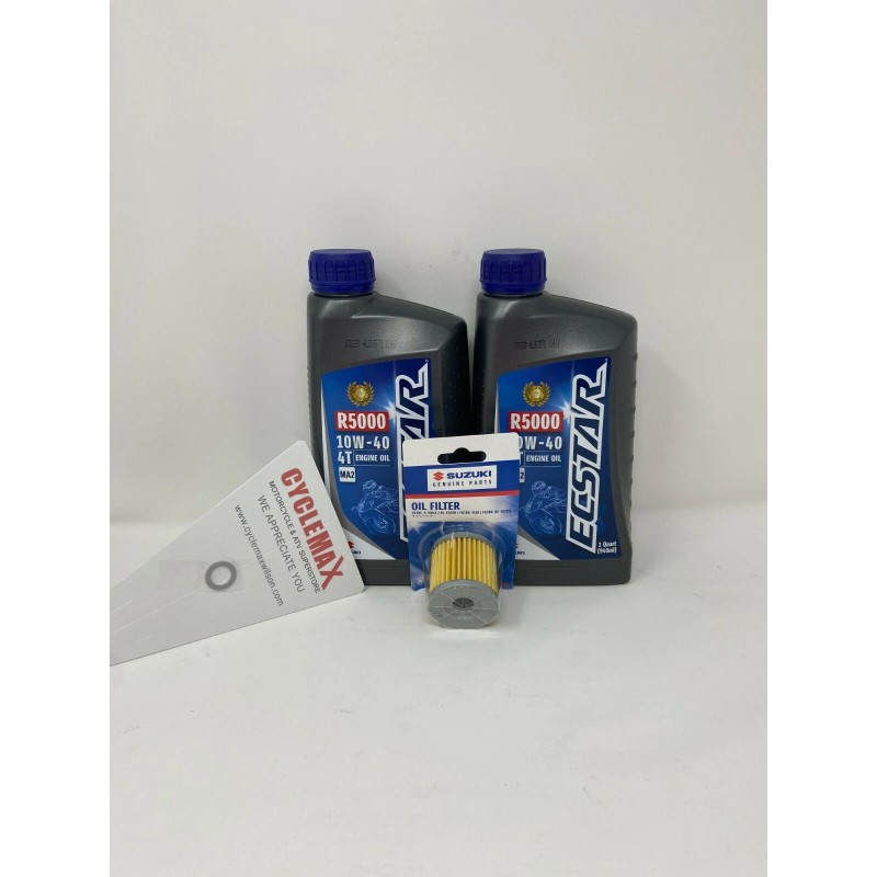 - Kit includes 2 Quarts of Suzuki 4-Cycle Motorcycle Engine Oil, One OEM Suzuki oil Filter, and One Crush Washer.