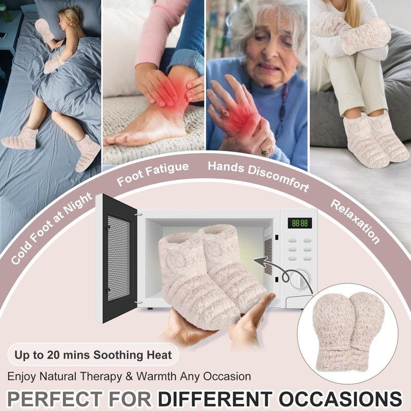 - Foot & Hand Discomfort Reduce Expert: Warmed in the microwave, the microwavable booties and gloves will help relax stiff muscles, bolster circulation and flexibility, and relieve discomfort. Unlike traditional heating pads, our heated booties and mittens are filled with natural seeds that deliver moist and deep-penetrating heat targeted to the feet/hands. If you're suffering from tired, sore feet and hands, this set includes microwave booties and gloves is a warm harbor for you!