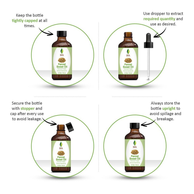 • Premium Quality Sweet Fennel Essential Oil: SVA Sweet Fennel Oil 4oz is an essential oil and is obtained by steam distillation of Foeniculum vulgare seeds. Our Sweet Fennel oil is free of preservatives and comes with a dropper for easy application. It is not tested on Animals. We care for you