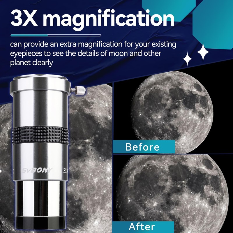 • SV137 Barlow lens 3x for each 1.25 inch eyepiece; double the power of a 1.25 inch telescope eyepiece with the Svbony SV137 Barlow lens