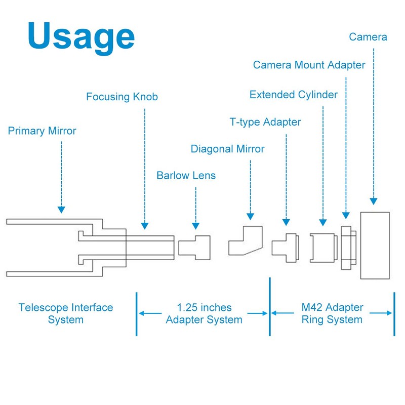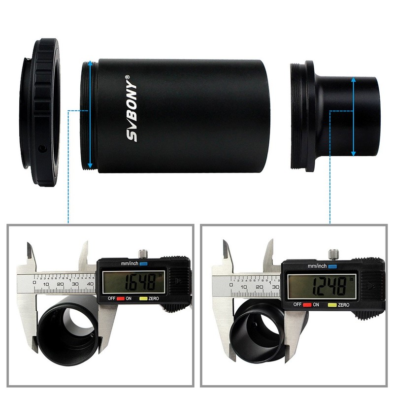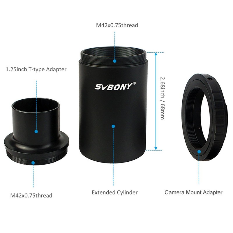 - 1.25" connector; the Svbony telescope camera adapter can be connected to a telescope with a 1.25" eyepiece port for direct focusing; or a 1.25" eyepiece can be mounted in the telescope camera for eyepiece projection for astrophotography