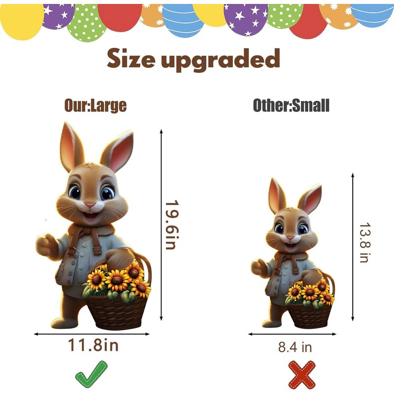 - Package Includes & Large Size: You will get 8 Easter bunny egg yard signs of varying colors and designs, with 24 Easter stakes included; Our Easter bunnies stand 19.6 inches tall and 11.8 inches wide and Easter eggs are approximately 12.2 inches tall and 8.8 inches wide; Large enough size to be noticeable and eye-catching from a long distance.