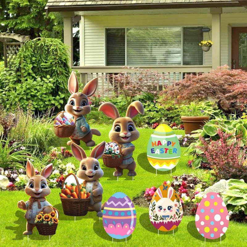 - Outdoor Easter Lawn Decorations Set Includes: This set includes 8 uniquely designed Easter bunny and eggs yard signs that feature adorable Easter-themed patterns.The 3D emboss effect gives the Easter garden signs a more dynamic and lively look,while the bright colors and cartoon bunny figures will attract attention and bring a joyful atmosphere to your yard.