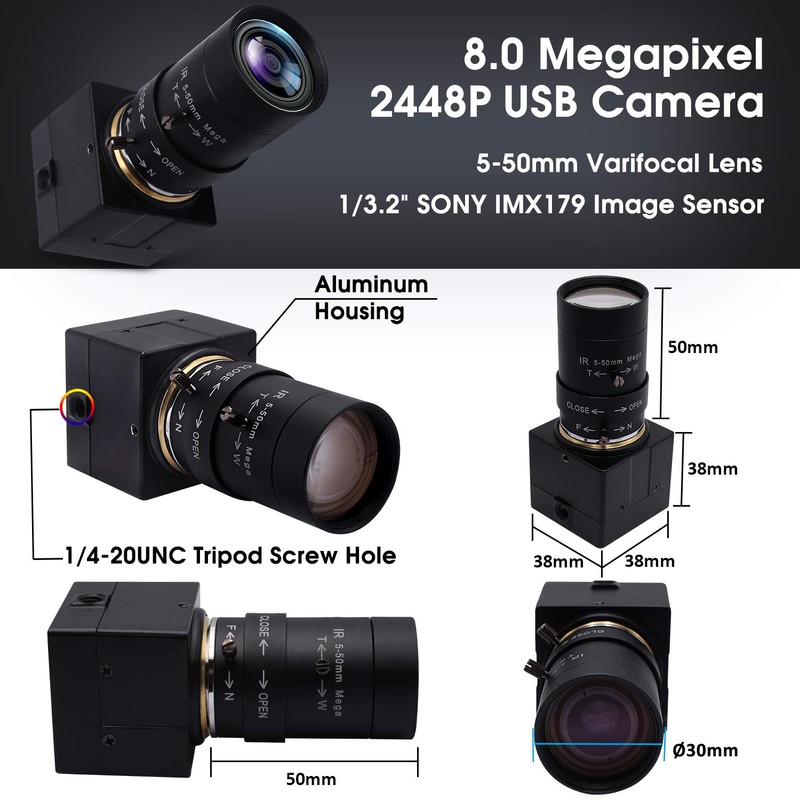 - 【Wide Applications】The 8MP USB Webcamera is varifocal lens with High definition and lower Color reproduction deviation produce decent and good image image and video,great fit for high standard medical and industry requirements, HD USB camera for all kinds of machine vision, 3D scanner,VR camera,electronic microscope,medical machine. Support to mount on a 1/4 tripod for webcam and computer camera