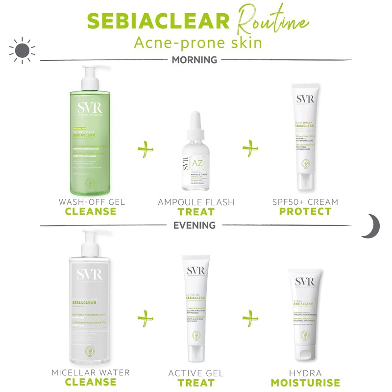 • Use in combination with our Sebiaclear Active Gel, Ampoule [AZ] Flash or Hydra Moisturiser to further soothe and / or hydrate irritated skin and help calm and diminish any blemishes.