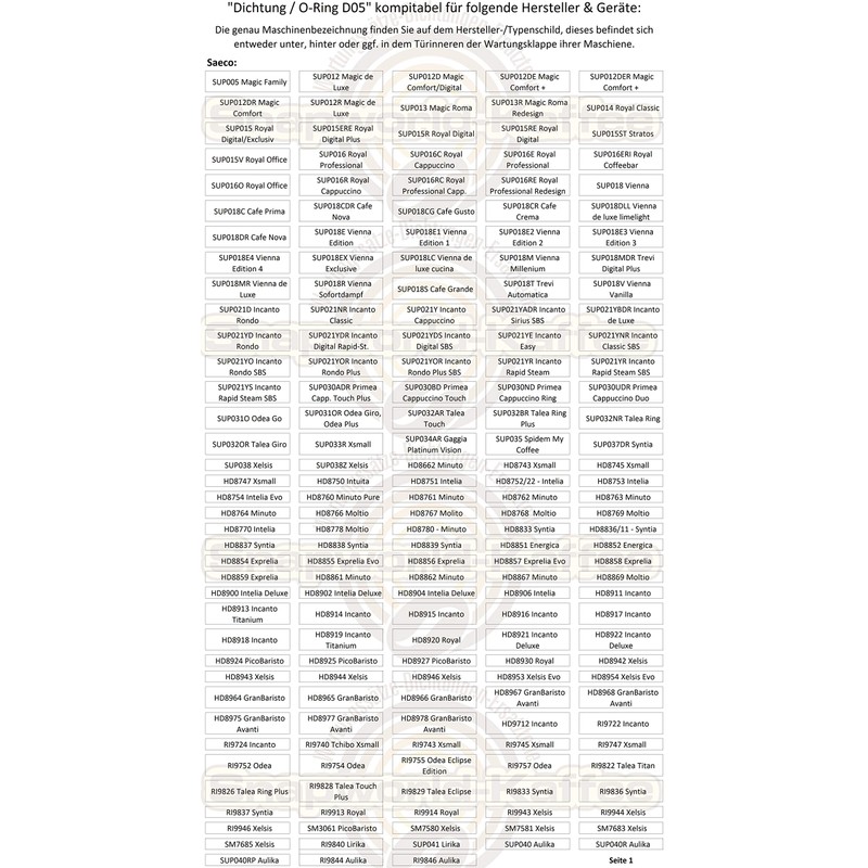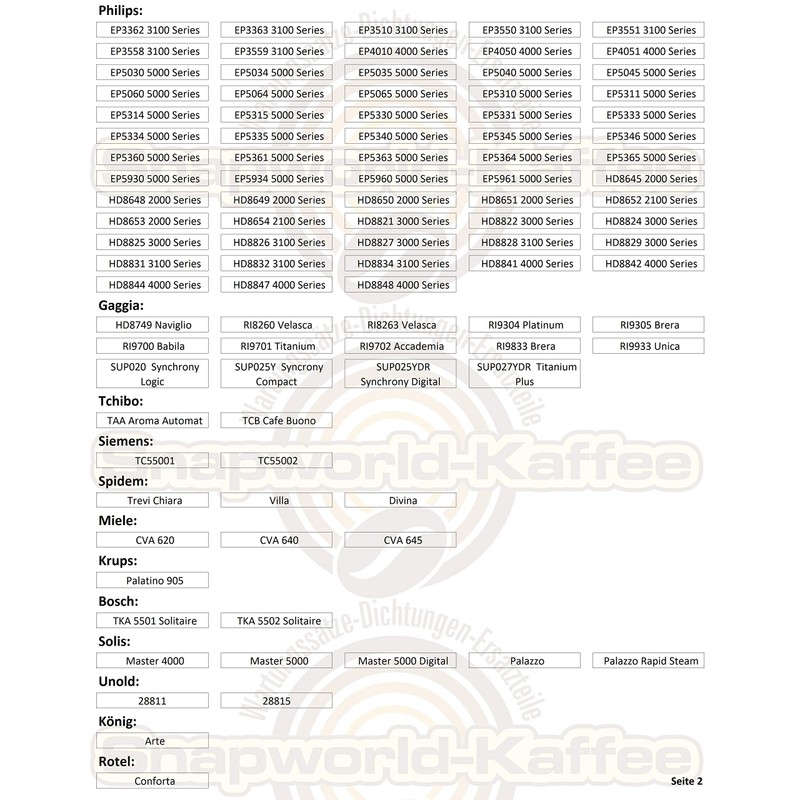 • Suitable for fully automatic coffee machine Philips - SAECO Exprelia Energica Incanto (except SBS which have 38 x 4 mm) Magic Royal Stratos Aulika Odea Primea Syntia Talea Vienna Xelsis Xsmall Intelia Intuita Minuto Moltio Spidem Trevi Chiara Villa Divina My Coffee Gaggia Syncgia rony Titanium ( Except SBS there is also 38 x 4 mm) Accademia, Cappuccino Platinum TCHIBO TX550 TAA TCB Miele CVA 620 640 645 KÖNIG Arte ROTEL Conforta KRUPS Palatino 905 Siemens TC Bosch Solitaire TKA Solis Master Palazzo