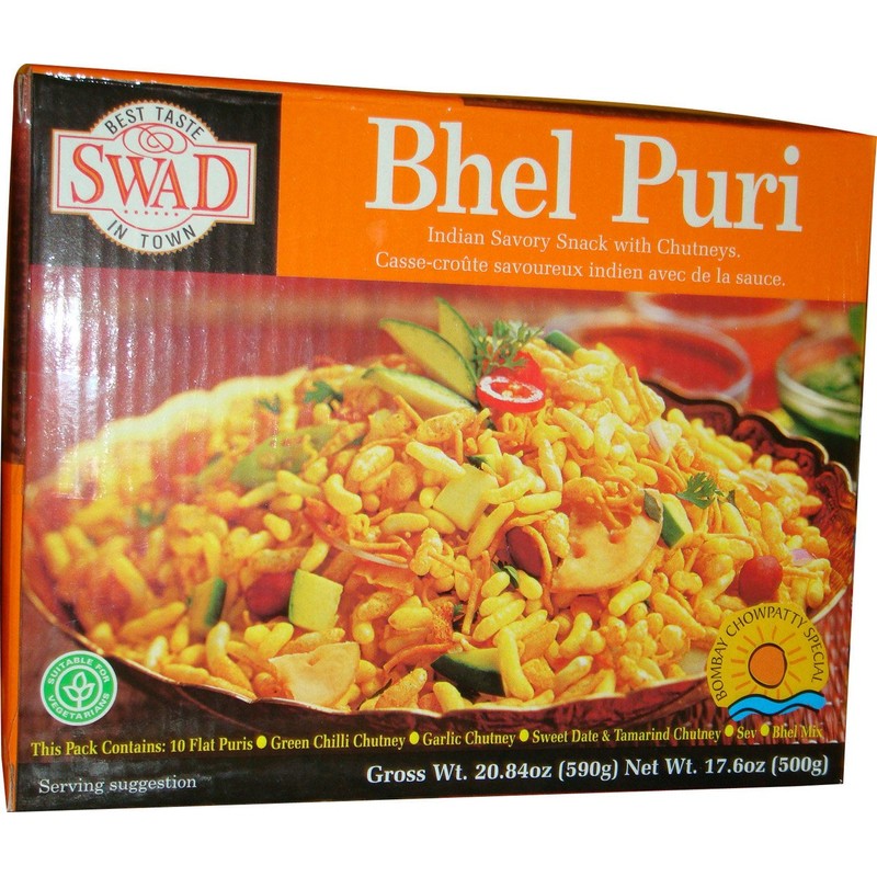 The ultimate bombay snack is chowpatty beach's bhel puri-savory, tangy bits and pieces, an edible symbol of this flirtations city of exiles and piaoneers. Swad brings you this delectable anytime snack in a ready to use kit. Simply follow the instructions and savor the taste of chowpatty.This pack contains 10 flat puris, green chilli chutney, Garlic chutney, sweet date & tamarind chutney, sev, bhel mix. Bombay chowpatty special Indian savory snack with chutney Country of Origin: Product of IndiaIngredients:Puris: Wheat flour, Refined palm oil, Salt.Green Chilli Chutney: Water, Green chili, Sugar, Coriander leaves, Corn flour, Salt, Vinegar, Preservative sodium benzoate).Garlic Chutney: Water, Sugar, Garlic, Chili powder, Salt, Gram flour, Vinegar, Preservative (Sodium benzoate).Sweet Date & Tamarind Chutney: Water, Jaggery, Sugar, Tamarind, Chili powder, Ginger powder, cumin powder, Salt, Black pepper, Corn flour, Vinegar, Preservative (Sodium benzoate).Sev: Gram flour...
