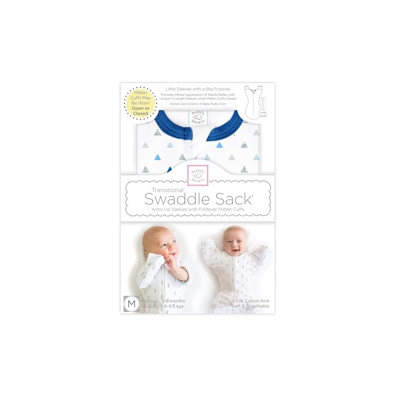 The transitional swaddle sack is designed to be the easiest way to transition from a snug swaddle. When baby is ready to transition from a swaddle or is showing signs of rolling over, the transitional swaddle sack is the easy way to transition baby out of a snug swaddle. It's also perfect for babies who prefer to sleep with arms up. The transitional swaddle sack supports baby in a back-sleeping position and allows for multiple arm and hand positions to help baby sleep better in their preferred position. The little sleeves of the transitional swaddle sack have a big purpose. When both fold over mitten cuffs are closed, the sleeves provide partial suppression of the Moro (startle) reflex, And if baby rolls over onto stomach, the unique sleeves allow baby to use their arms to lift their torso and reposition their head to get access to air. When the mitten cuffs are closed, the uniquely shaped arms up design positions baby's arms in a flexed, close-to-body, arms-up position, and the shape and length of the sleeve helps partially suppress the startle reflex. The uniquely-shaped arms up 1/2 length sleeves are not full length "by design." parents are encouraged to close the cuffs first, and then place baby in the sack. If the caregiver wants to allow baby to suck directly on hands, then open one of the mitten cuffs. The 2-way zipper makes the transitional swaddle sack easy to use. The zipper has two zipper pulls - one at the neckline and one at the foot of the sack for easy diaper changes. Winner of multiple awards. Recognized by the International Hip Dysplasia Institute as Hip Healthy. The lower section supports baby's legs in a flexed position. The hip Healthy design allows baby's knees and hips to flex and legs to stretch. Made from premium, stretchy interlock cotton knit. Always place baby on their back for every sleep including naps. Machine washable. Transitional swaddle sack is a registered trademark of SwaddleDesigns. Us patent D833, 613.